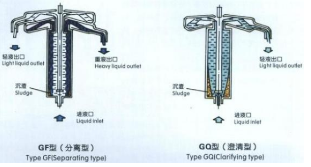 管式分離機的工作原理簡單的說來就是:含有細小顆粒的混合液體,因液位差的壓力, 自流入告訴旋轉的管式離心內(nèi)部的轉鼓里。在轉鼓告訴旋轉的時候, 密度比水(1000kg/m3)大的固體或者顆粒直徑較大的固體因為受到離心機的作用會堆積在轉鼓壁上,而混合液的液體(上清液)由于密度比固體大,所以比較‘輕’,會在分部在固體以外的靠近轉鼓圓心的方向。當混合液連續(xù)進入轉鼓內(nèi)分離以后,固體和上清液會越來越多,直到上清液自溢出轉鼓(見圖2)。從這個分離原理我們可以看出,管式離心機分離精度,在轉速一定的情況下,主要是取決于固體顆粒的密度和粒徑的。 密度越大的顆粒,哪怕粒徑非常小,小到納米級的顆粒,管式離心機也可以輕輕松松的實現(xiàn)固液分離。反而言之,密度比較小的顆粒就沒那么簡單了。 如果固體顆粒的密度比較小,但又大于液體的密度, 那么一般來說,顆粒直徑越大約容易分離。對于這種固體顆粒,管式離心機一般的分離精度在1微米左右。如果固體顆粒的密度小于混合液體的密度,處于懸浮狀態(tài)的話, 那么這個就比較難判斷了, 需要根據(jù)具體的物料信息才能得出結論。