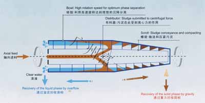 本公司制造的污水處理成套設備,是采用全封閉連續(xù)運行的大長徑比臥式螺旋卸料沉降離心機(簡稱臥螺離心機)作為污泥脫水的主機,它具有以下優(yōu)點: