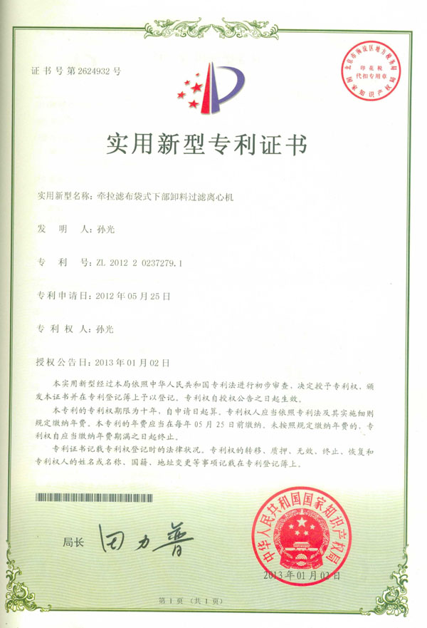 牽拉濾布袋式下部卸料過濾離心機(jī)專利證書