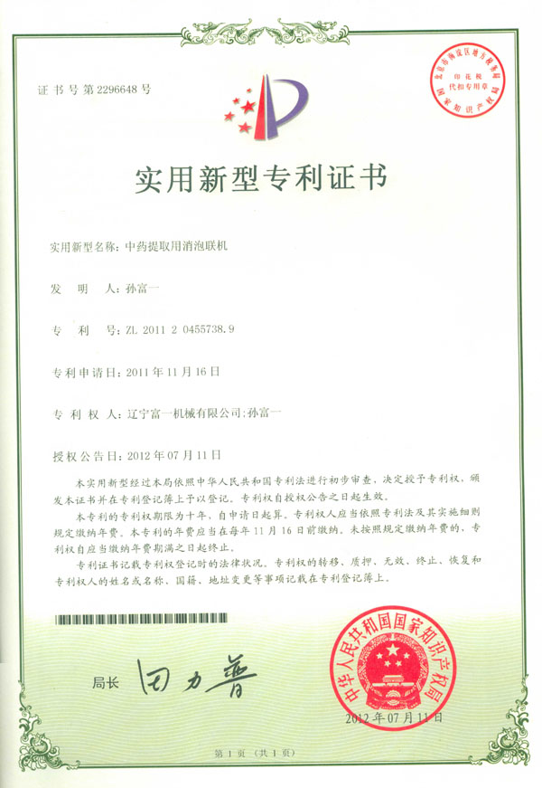 中藥提取用消泡聯(lián)機(jī)專(zhuān)利證書(shū)